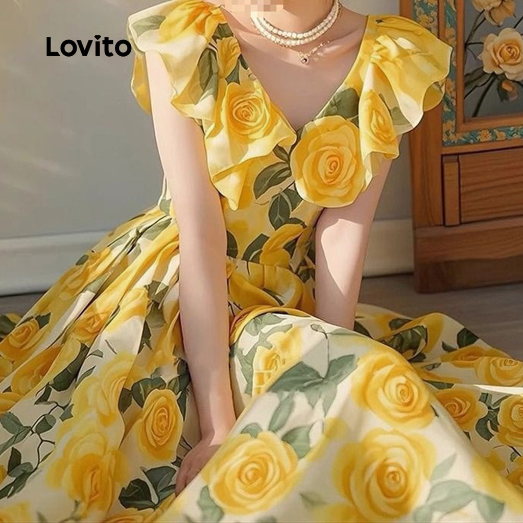 Lovito Vestido Boho Com Babados E Flores Amarelo Para Primavera/verão Feminino L150ED144