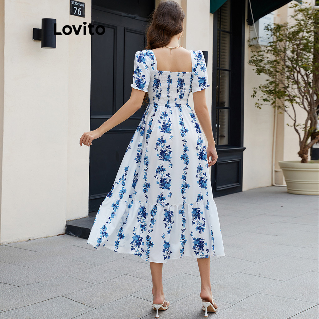 Lovito Vestido Boho Floral Ruffle Hem Verão Praia Férias Vestido Midi Para Mulheres LBL19820