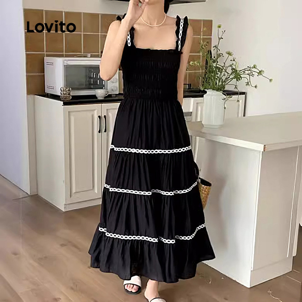 Lovito Vestido Boho Franzido com Fita de Contraste Babados Textura Suave Primavera Verão Preto L138ED459