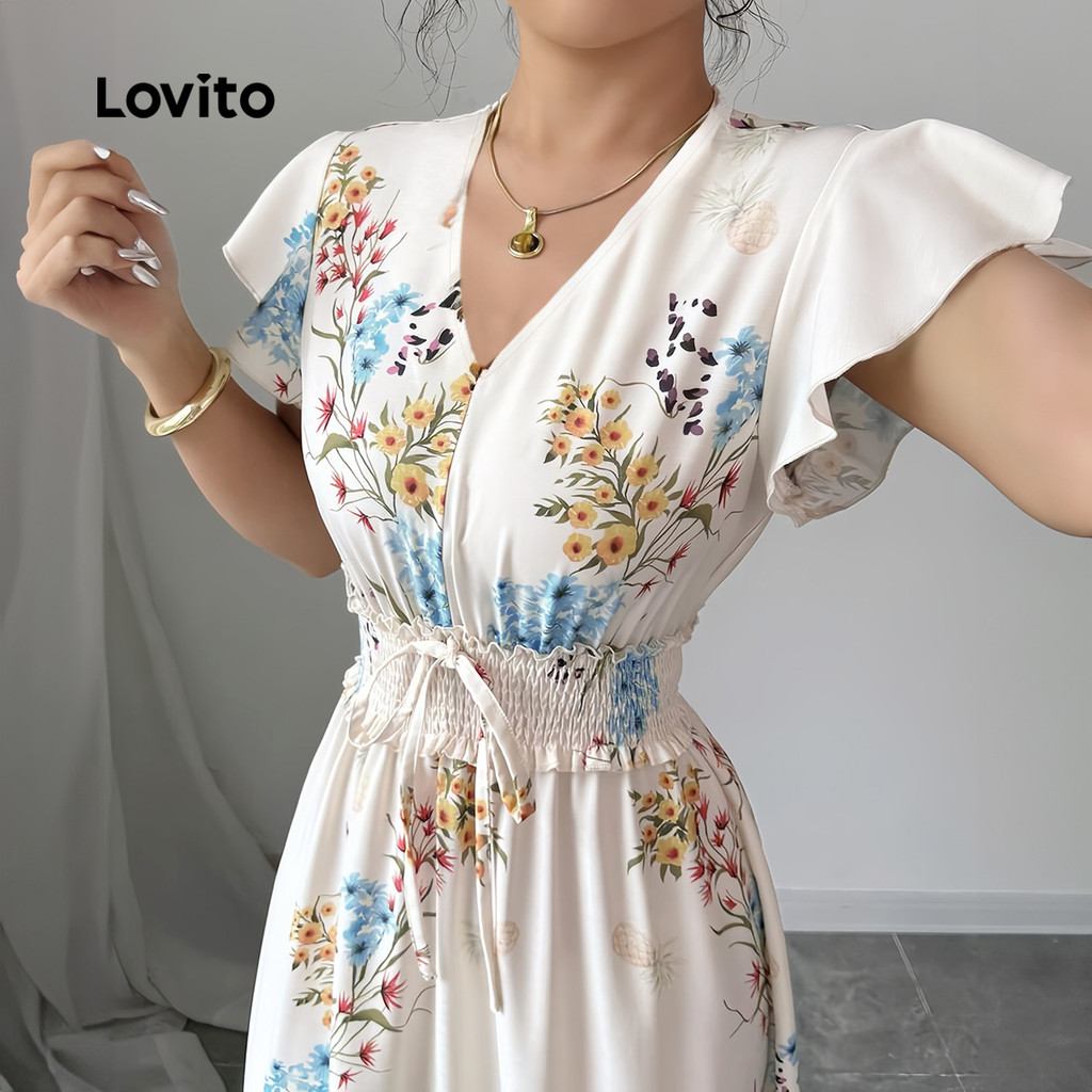 Lovito Vestido Boho Plissado Smocked para Mulheres - Vestido Primavera/Verão LBL32051