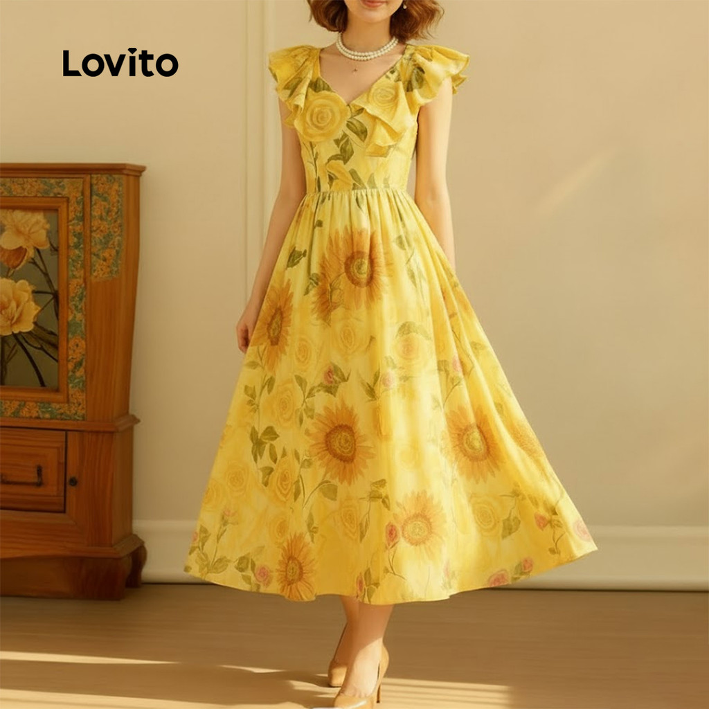 Lovito Vestido Boho Volante Vincent Van Gogh Girassóis Primavera/Verão para Mulheres LFI1ED009