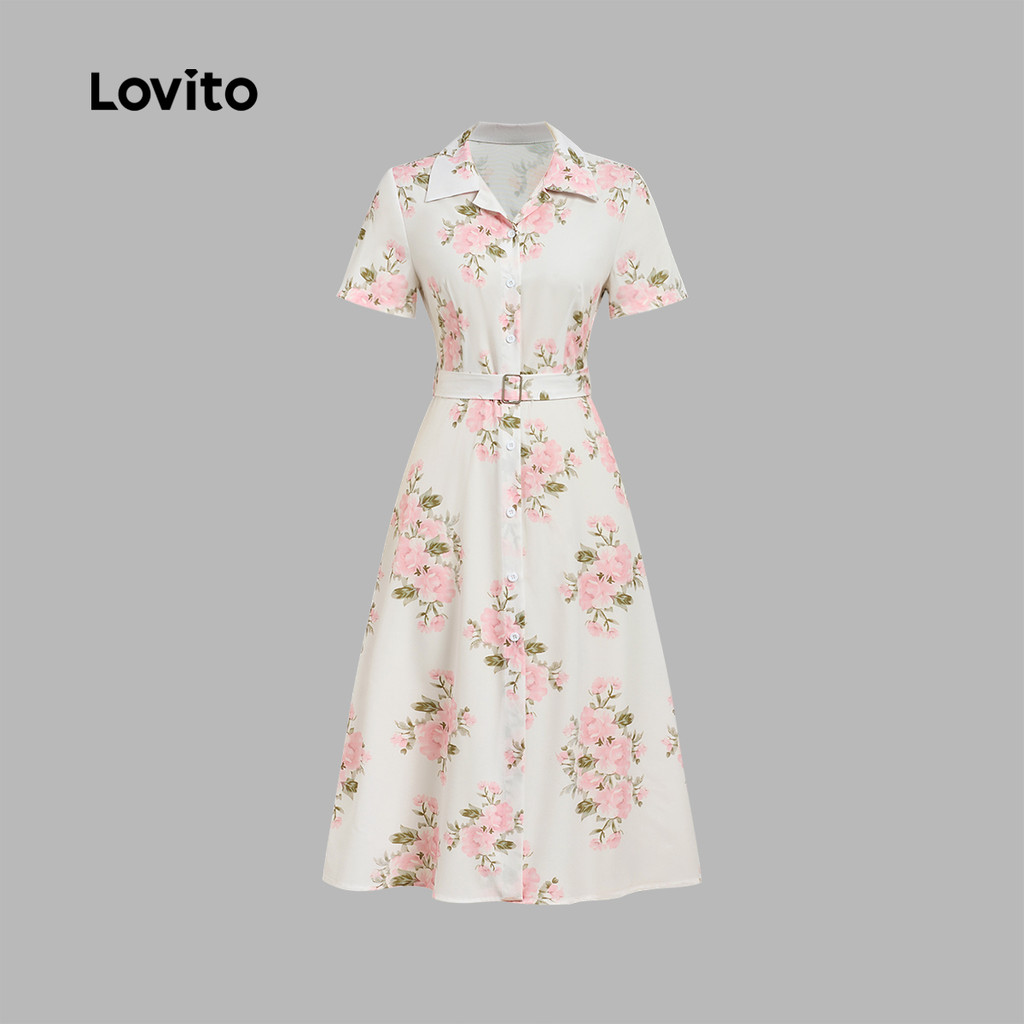 Lovito Vestido Branco Casual Chique E Elegante Com Estampa Floral Botões Frontais E Cinto Primavera/verão LBL32066