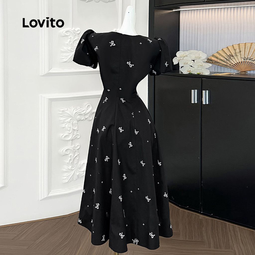 Lovito Vestido Casual Com Botões Frontais E Estampa De Vestido Preto Para Mulheres, Verão/primavera L134ED529