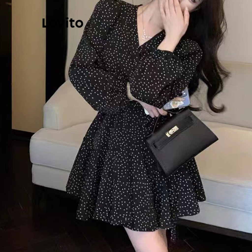 Lovito Vestido Casual De Bolinhas Com Manga Bufante Para Mulheres LNE27238 (Multicolorido)
