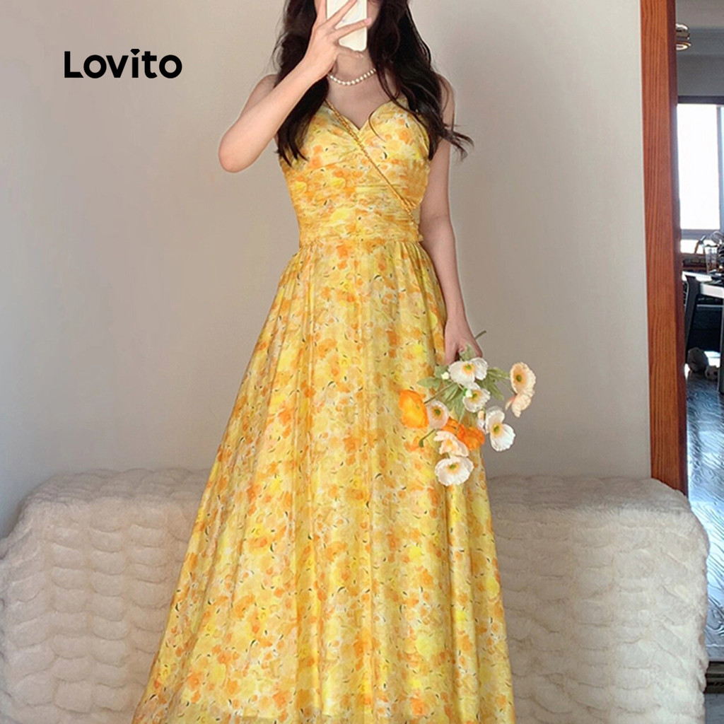 Lovito Vestido Casual de Estrutura com Pregas Primavera/verão Amarelo para Mulheres L138ED249