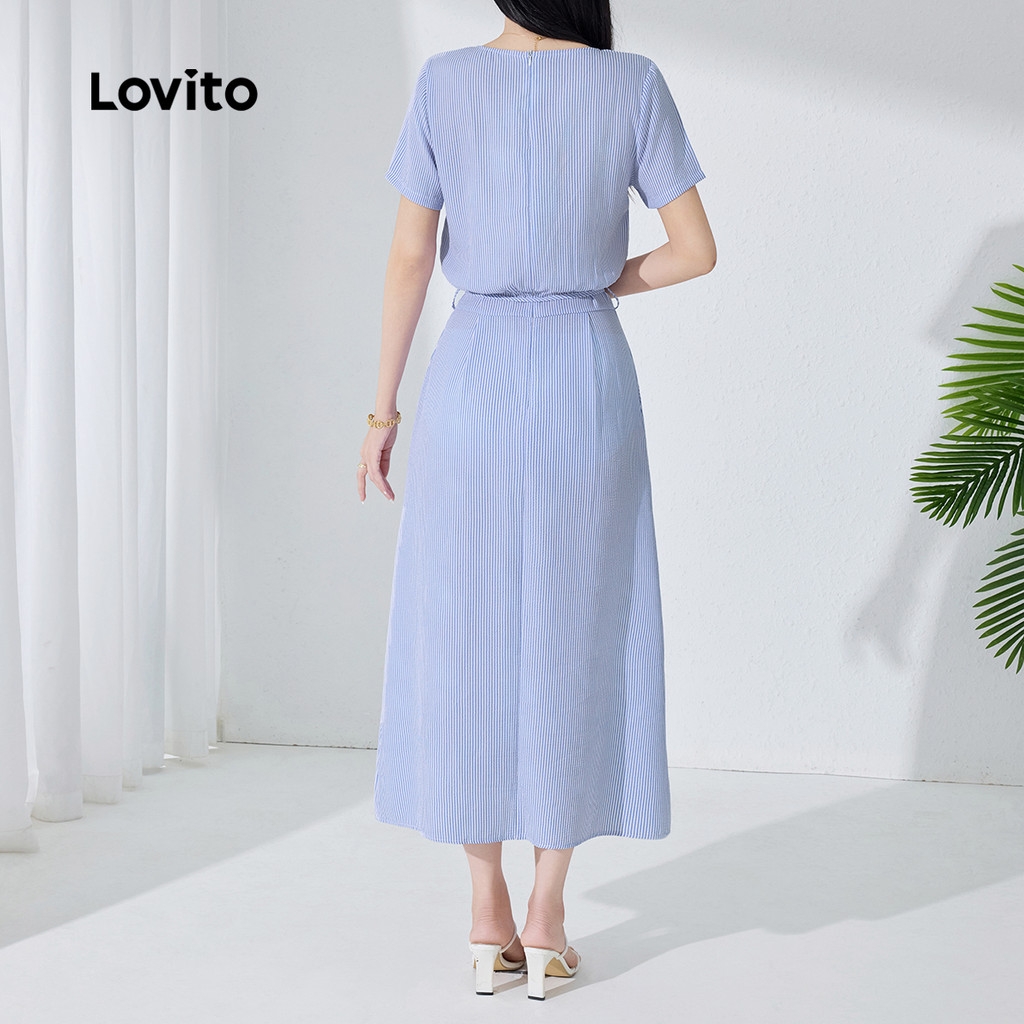 Lovito Vestido Casual de Primavera/verão Azul para Mulher com Atenção e Corselete de Amarrar em renda L154LD358