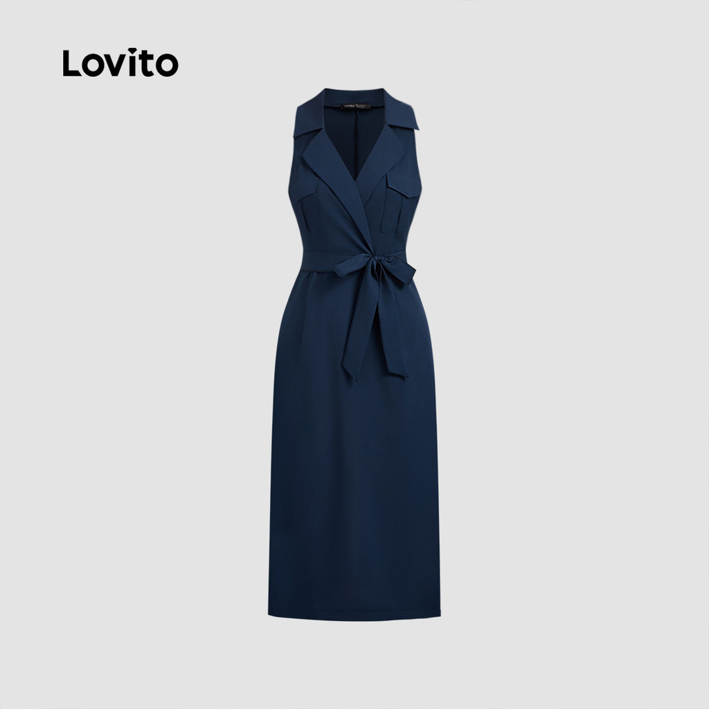 Lovito - Vestido Casual de Primavera/verão Azulmarinho com Bolsos Cinto e Tecido Macio e confortável L138ED158