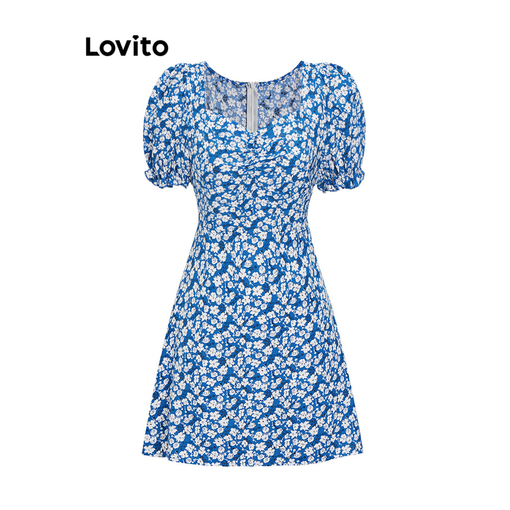 Lovito Vestido Casual Ditsy Floral Plissado Manga Bufante Para Mulheres L62ED140 (Multicolorido)