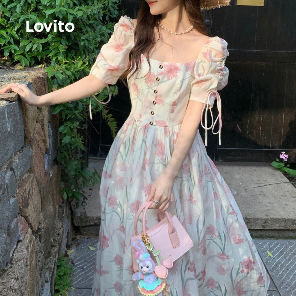 Lovito Vestido Casual Estampa Floral Botões Frontais Zíper Amarração Primavera/verão Perfeito Para Mulheres LBL27389