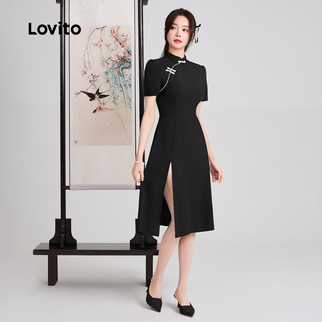Lovito Vestido Casual Estilo Chinês Cheongsam Qipao Botão Primavera/verão Preto L166AD247