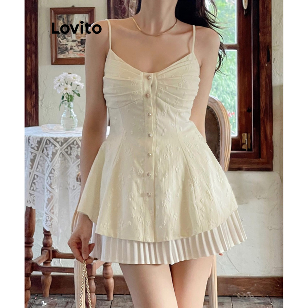Lovito Vestido Casual Feminino de Verão com Plissado em Jacquard e Botões L86ED347