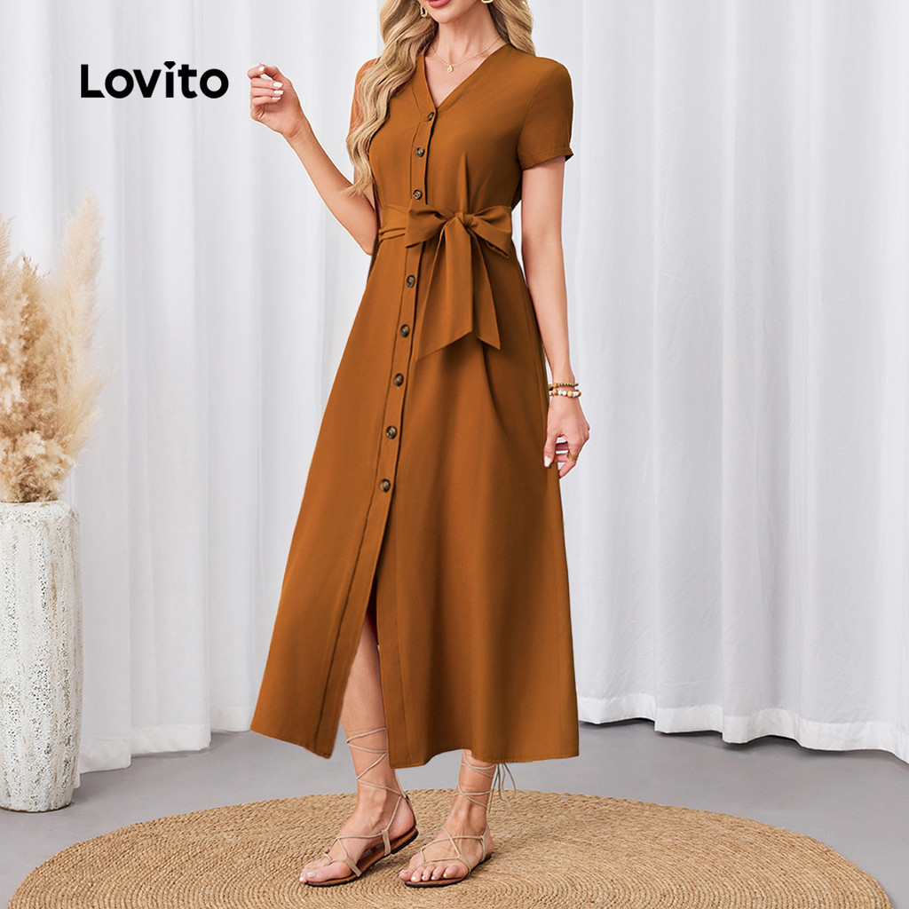 Lovito Vestido Casual liso com amarração frontal e botão para mulheres LBL23902
