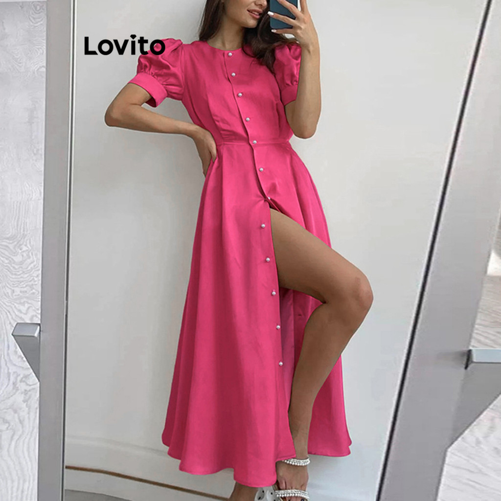 Lovito Vestido Casual Liso Com Botão Dividido Na Frente E Manga Bufante Para Mulheres LNE27187 (Multicolorido)