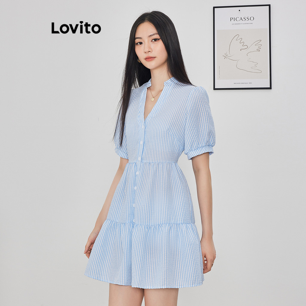 Lovito Vestido Casual Listrado Franzido Manga Bufante Para Mulheres L62ED137 (Azul)