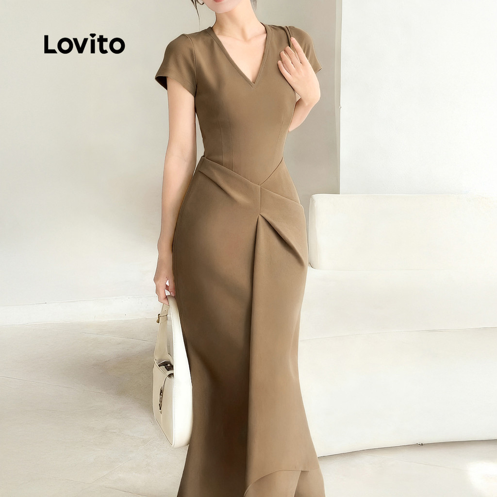 Lovito Vestido Casual Plissado Assimétrico Primavera/verão Cáqui para Mulheres L171ED1021