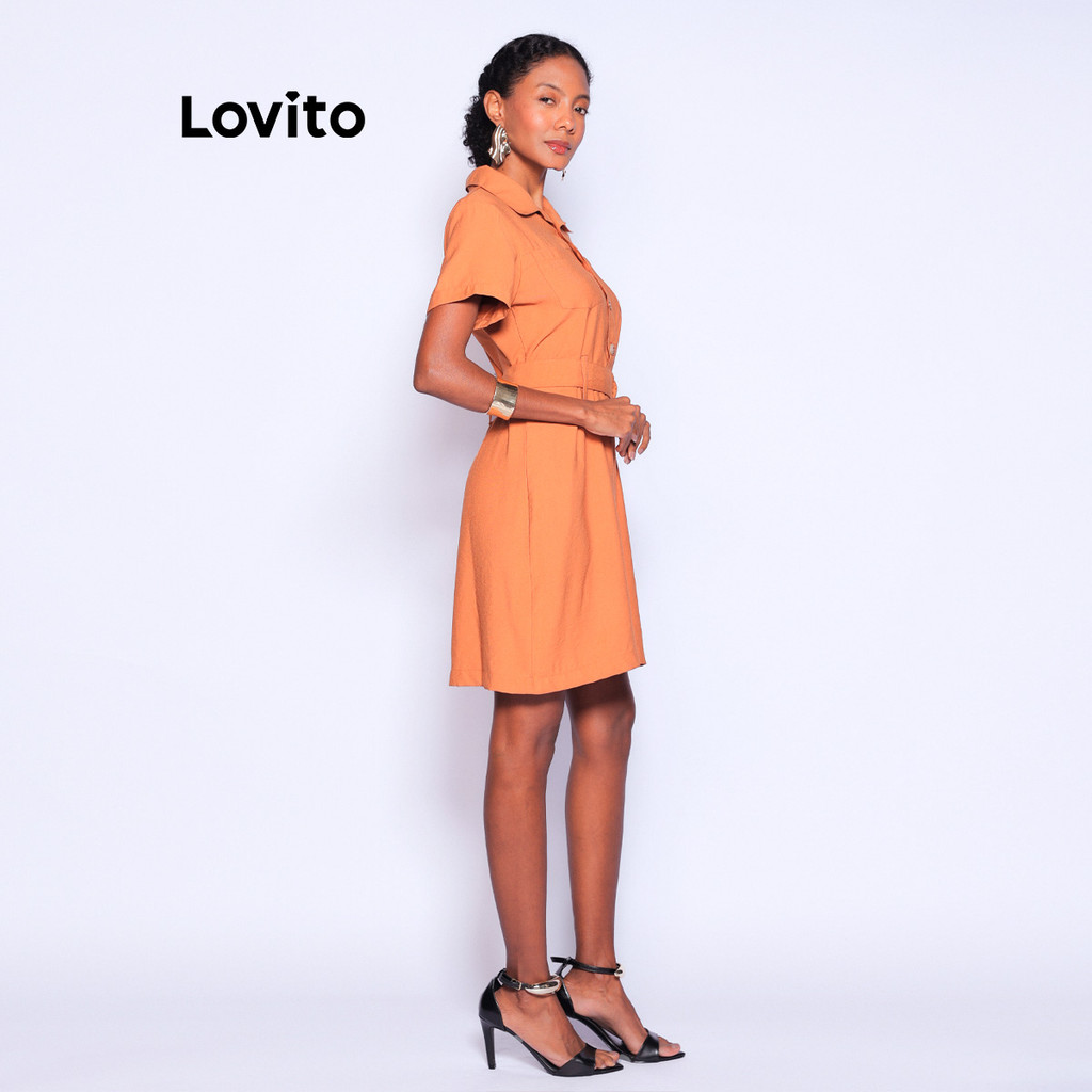 Lovito Vestido Curto Acinturado com Gola Manga Curta Casual Liso com Cinto Feminino LB956BRL986