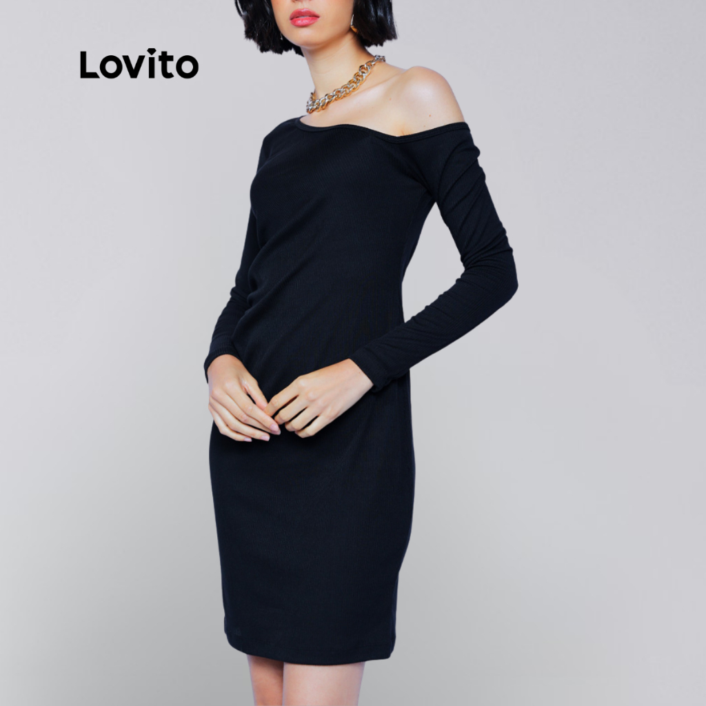 Lovito Vestido Curto Manga Longa Basico Ombro Caido Elegante Liso Feminino LB611BRL641