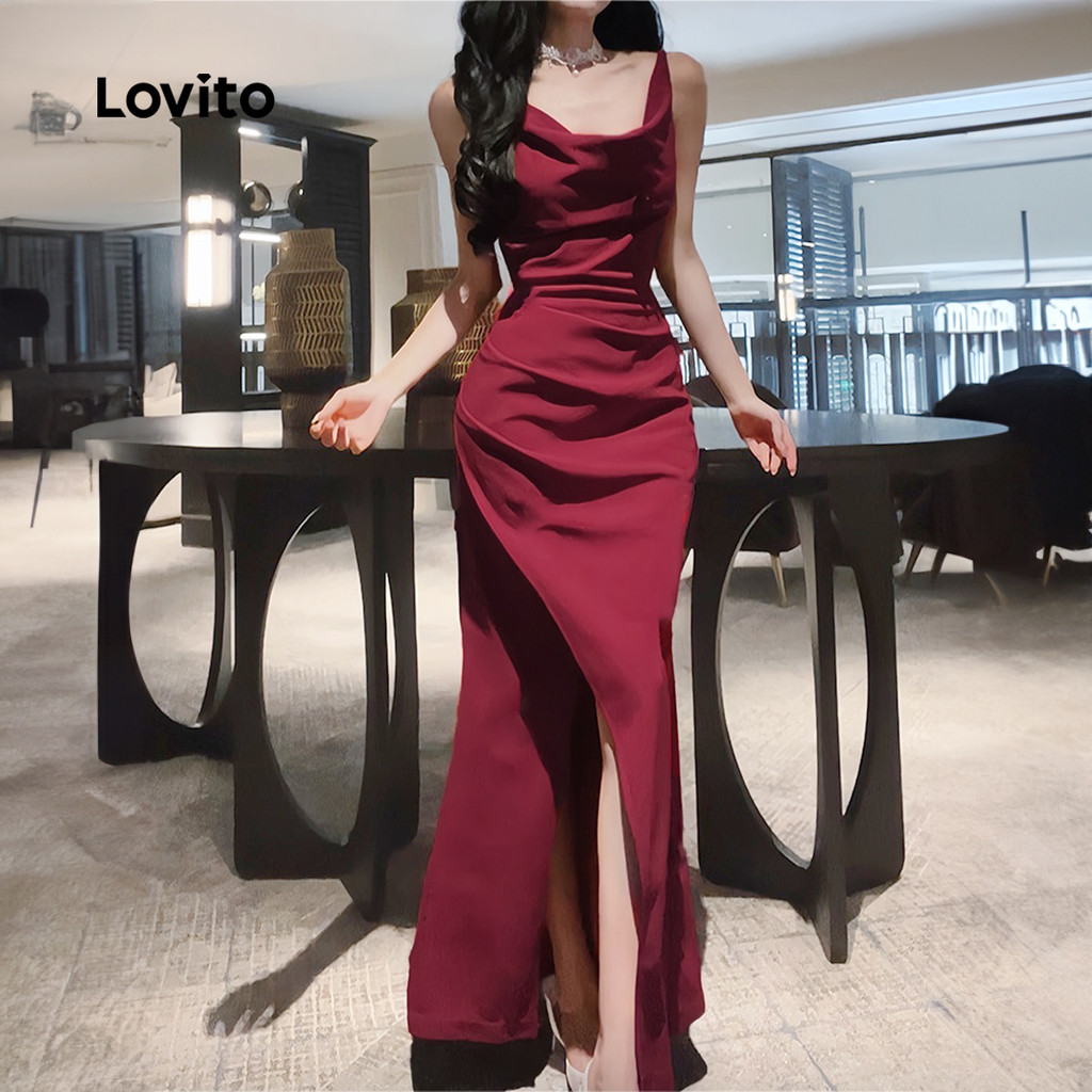 Lovito Vestido De Festa Com Fenda Frontal E Pregas Cor Vinho Para Primavera/verão L155ED043