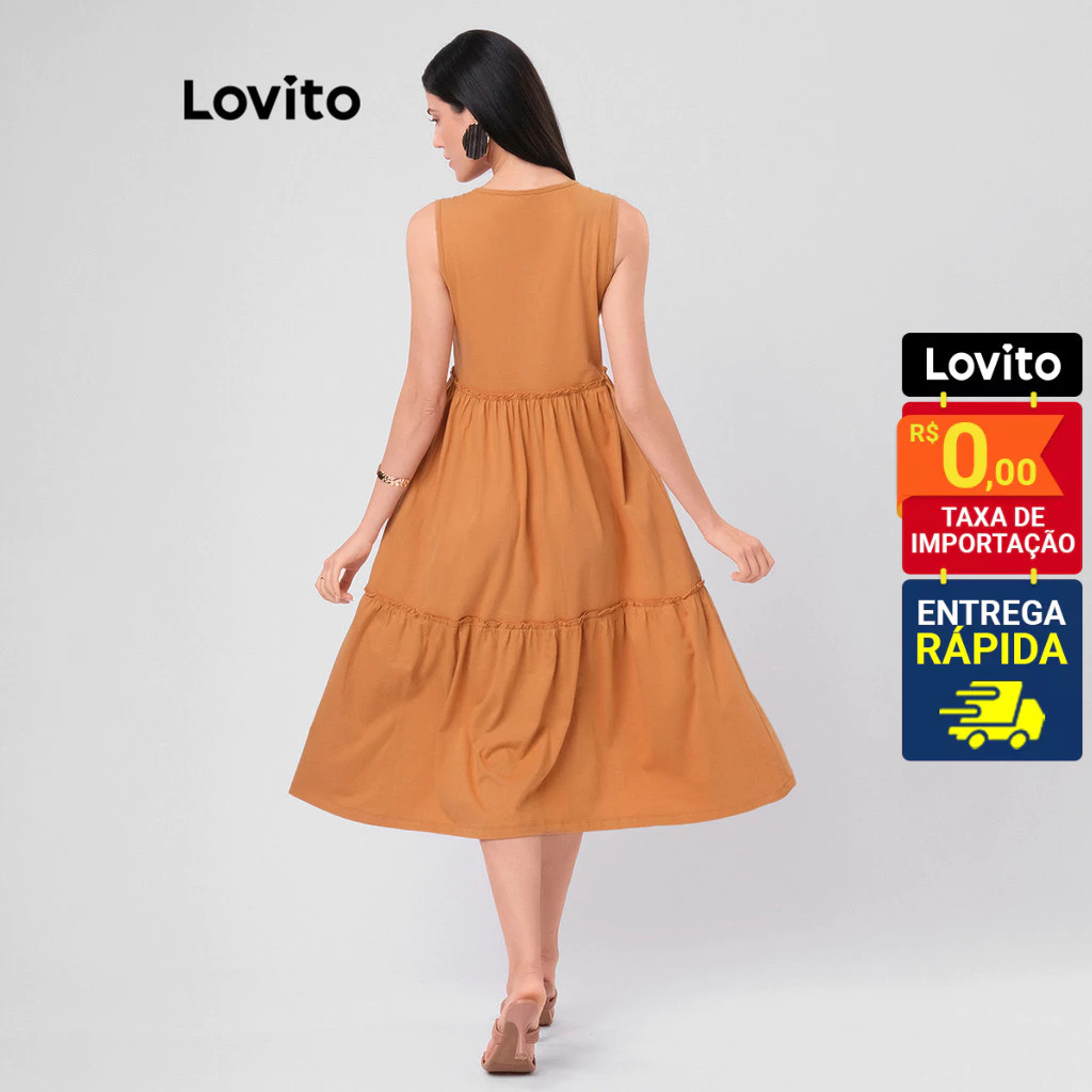 Lovito Vestido Decote Redondo Midi Com Babados Basico Feminino LB36BRL065