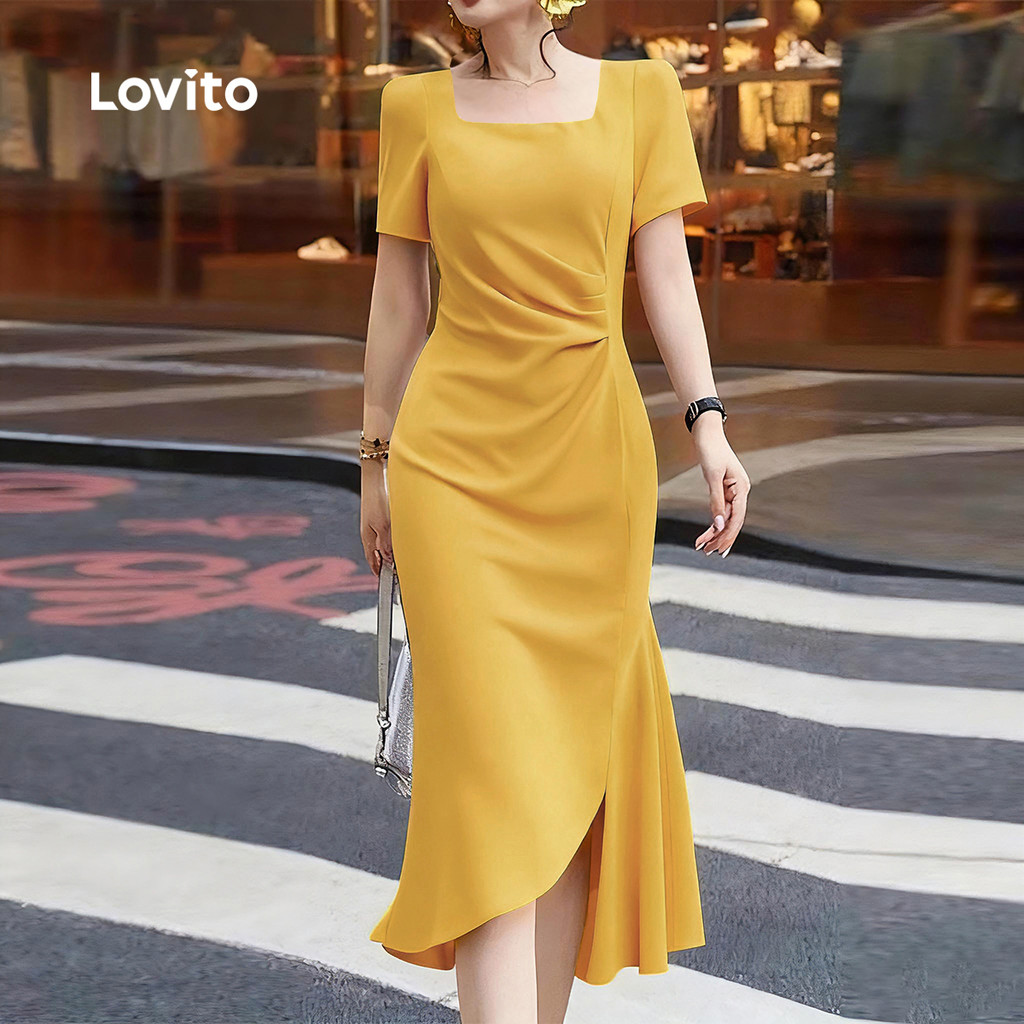 Lovito Vestido Elegante Assimétrico de Pregas Primavera/verão Vestido Leve Amarelo para Mulheres L154ED1138