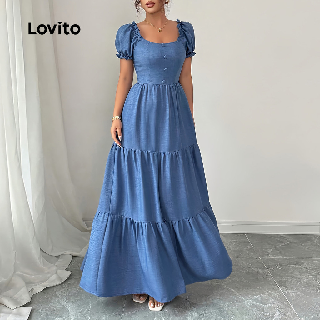 Lovito Vestido Elegante Camadas/Botões Frente Primavera/Verão Azul Vestido Evangélico Mulheres LBL29096