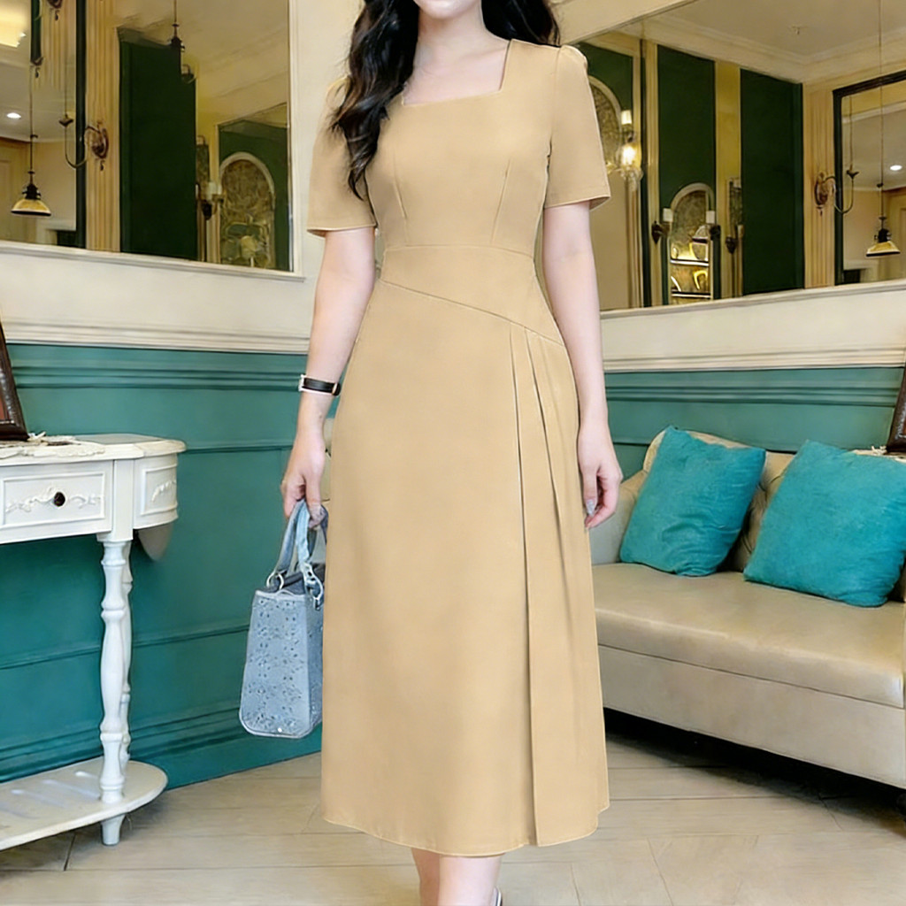 Lovito Vestido Elegante Clássico e Versátil com Pregas e Estrutura para Primavera/verão em Caqui para Mulheres LBL33009