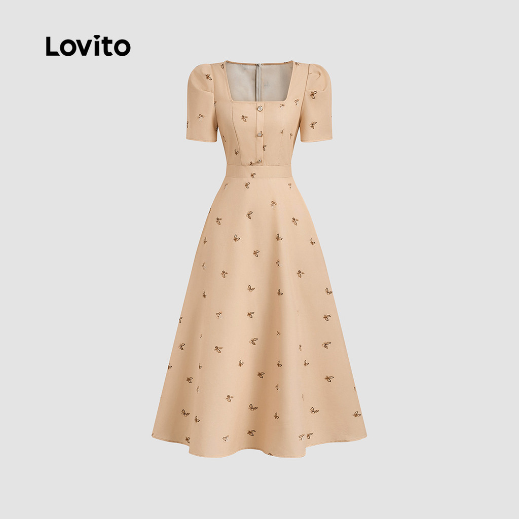 Lovito Vestido Elegante com Botões Na Frente Estilo Francês Preguiçoso Primavera/verão Vestido cáqui L154LD065