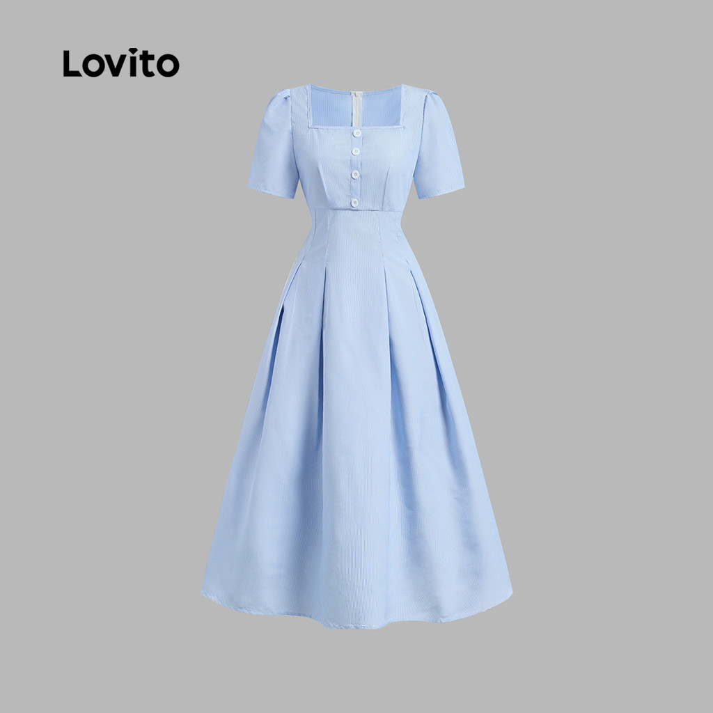 Lovito Vestido Elegante com Botões Primavera/Verão Azul Vestido Evangélico para Mulheres LBL29040