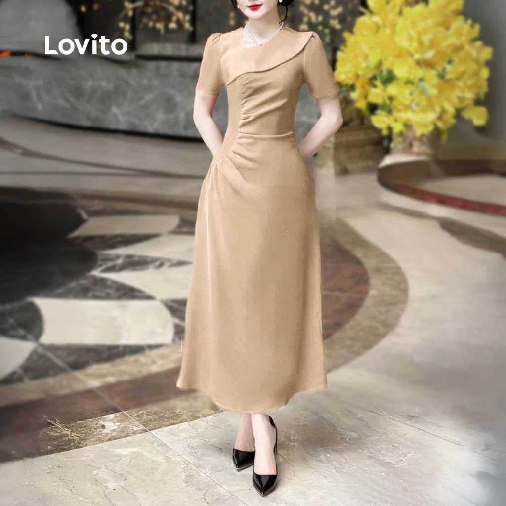 Lovito Vestido Elegante com Pregas Estrutura Linha Comute Primavera/verão Khaki para Mulheres L178ED2156