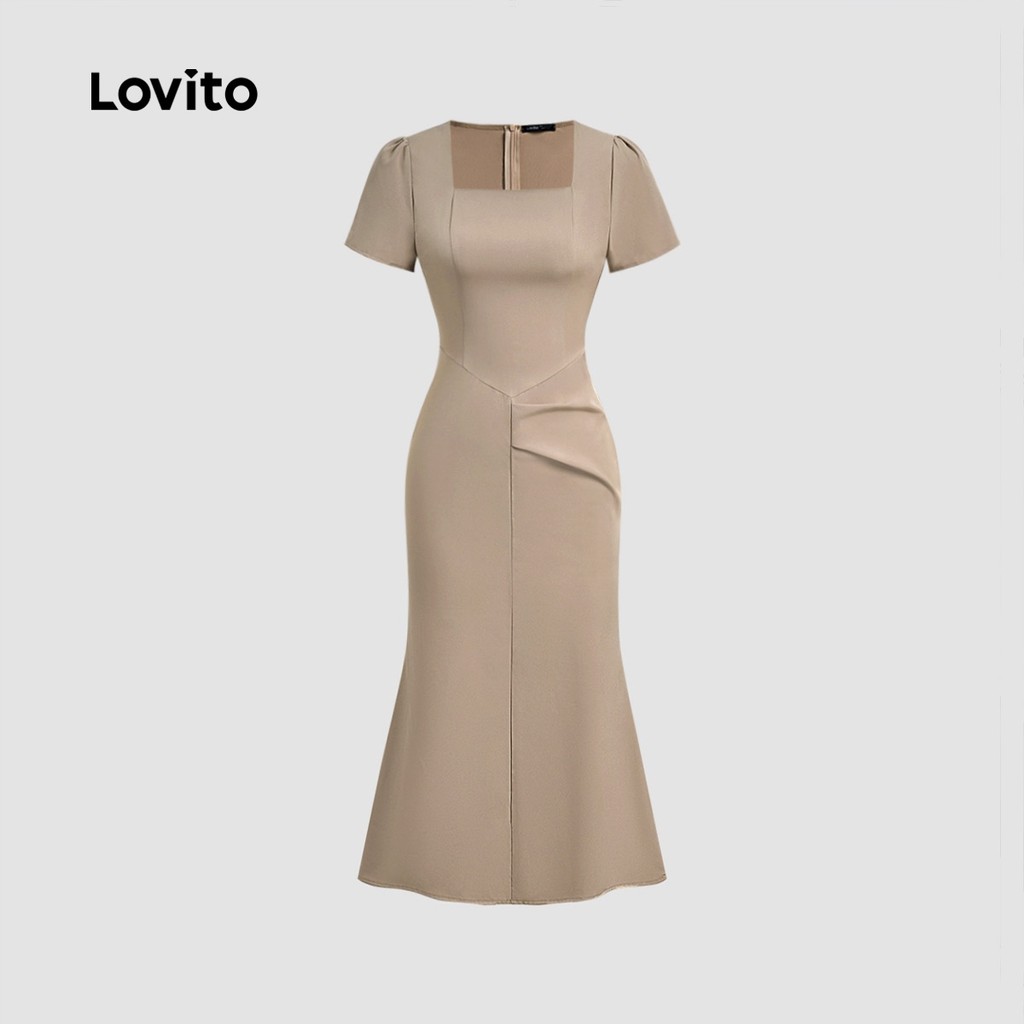Lovito Vestido Elegante De Verão/primavera Com Pregas Estruturadas Na Cor Cáqui Para Mulheres L155AD2034