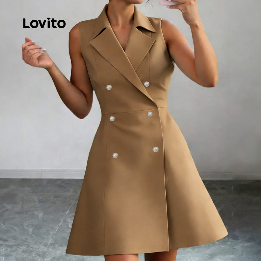 Lovito Vestido Elegante Duplo Botão para Deslocamento Primavera/verão Vestido Cáqui para mulheres. LBL33013