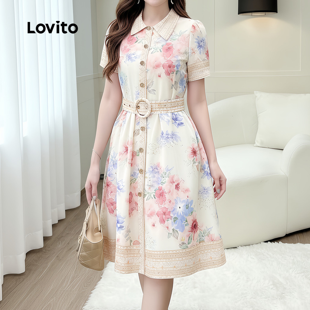 Lovito Vestido Elegante Feminino com Cinto e Botão Perfeito para Primavera e verão LK5LD130
