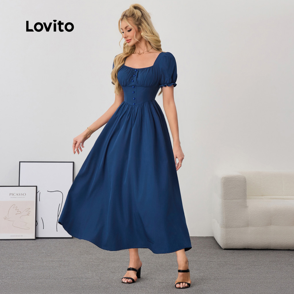 Lovito Vestido Elegante Feminino Estrutura Lisa Linha Botão Frontal Vestido De Verão/primavera LBL24070