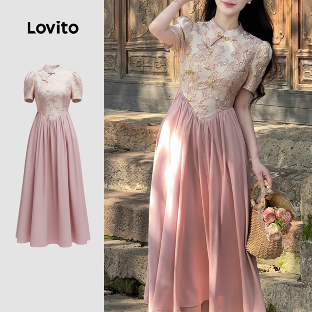 Lovito Vestido Elegante Novo Estilo Chinês Costura em Tecido Primavera/verão Vestido Rosa para mulheres LK2ED443