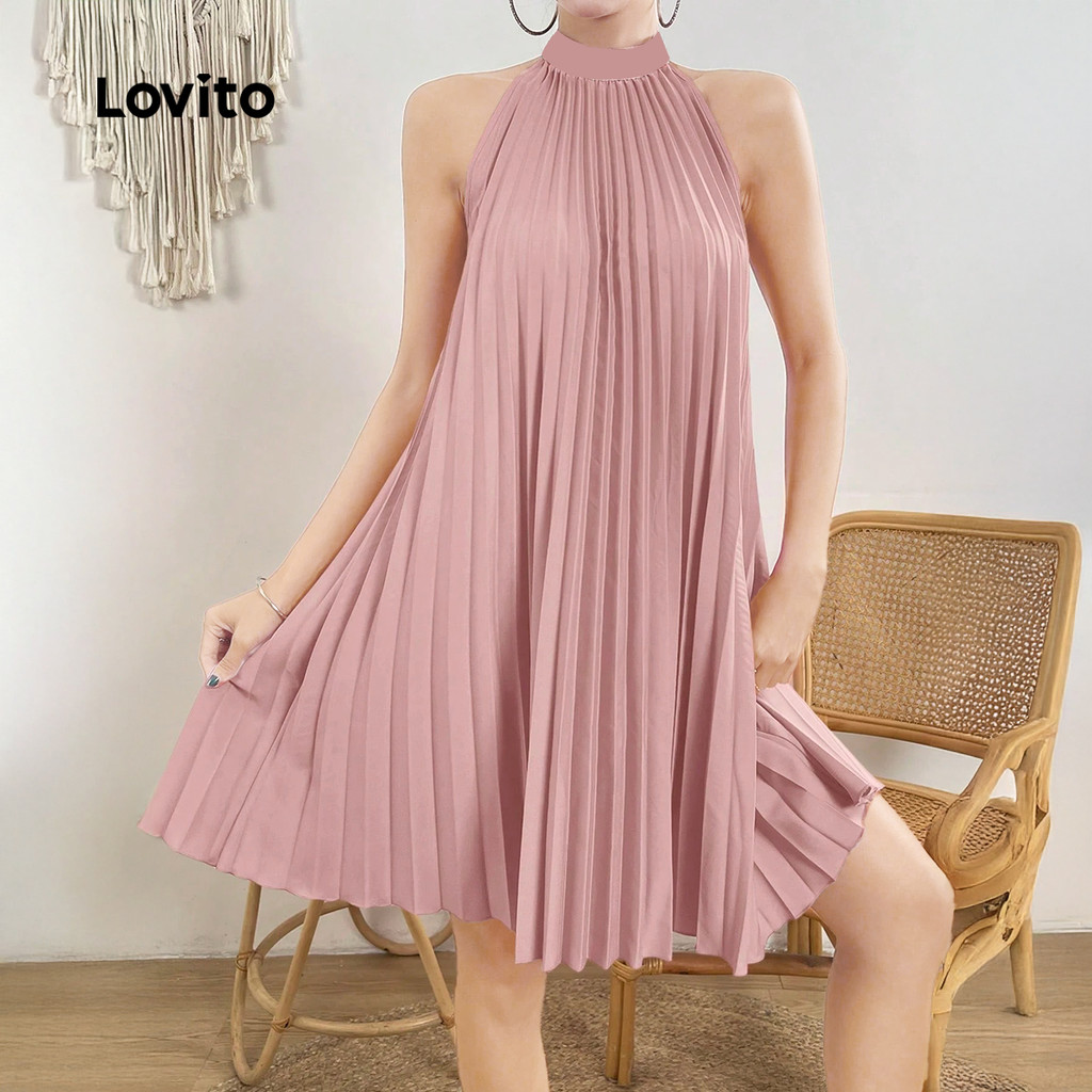 Lovito Vestido Elegante Plissado Francês Estilo Preguiçoso Primavera/verão Rosa para Mulheres LBL33008