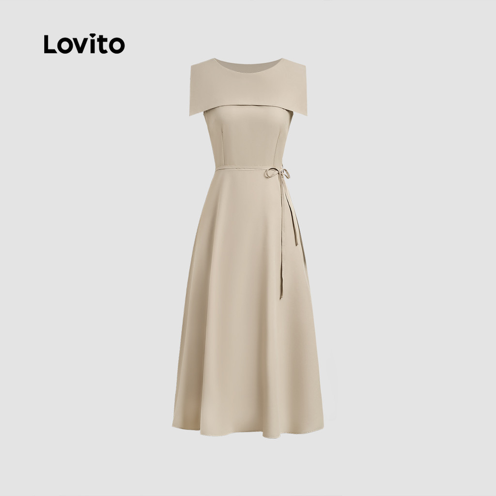 Lovito Vestido Elegante Retrô com Cinto para Deslocamento Primavera/verão Vestido Caqui para mulheres L142ED215