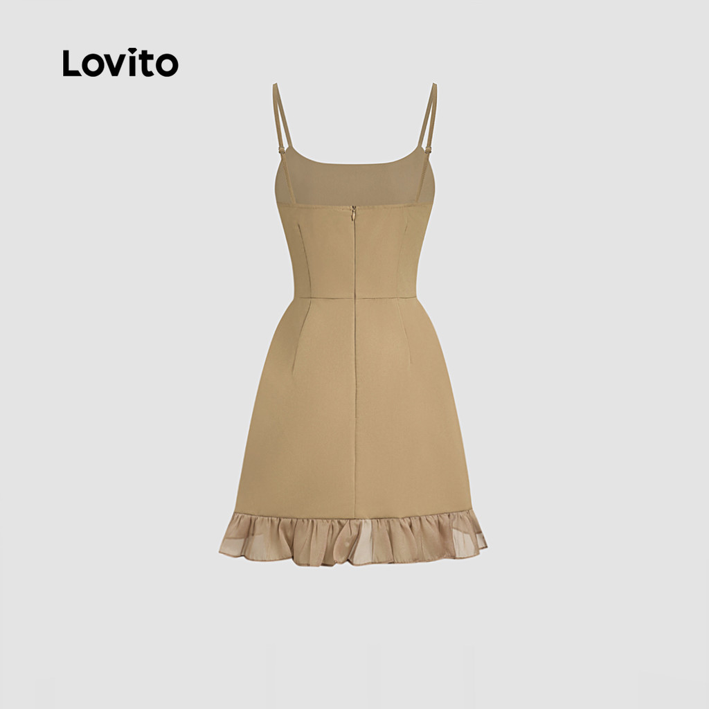 Lovito Vestido Elegante Tecido Costura Babado Alça de Ombro Ajustável Primavera/verão Caqui para Mulheres L171ED136