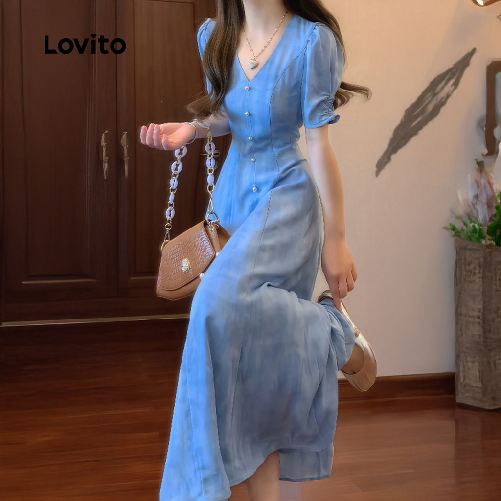 Lovito Vestido feminino Casual Azul com botões para Primavera Verão L158AD190