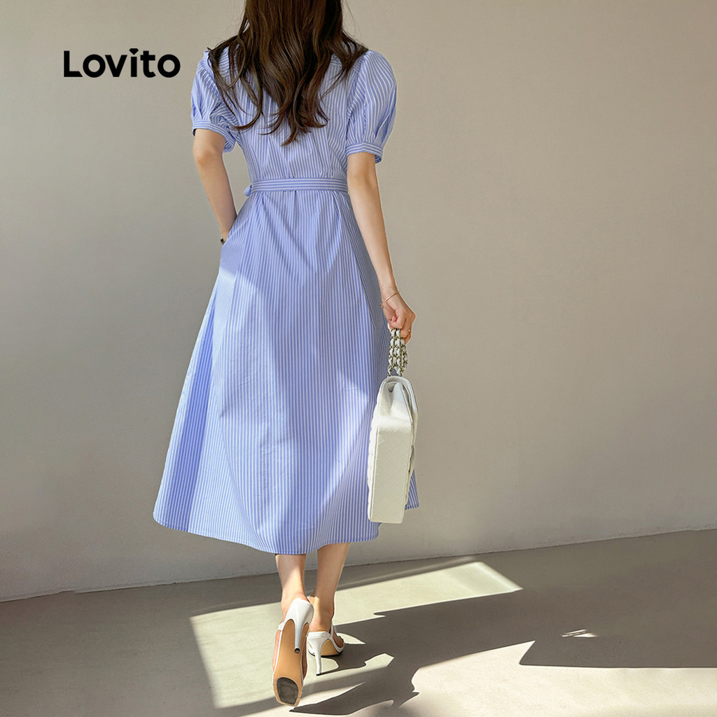 ✅DESTAQUES -❤️Com cinto -❤️Botão frontal -❤️Sentimento de mão suave -❤️Primavera e verão ✅DESCRIÇÕES Estampa / Padrão:Listrado Estilo:Casual Tipo de vestido:A Linha Tamanho Plus:Não Material:Poliéster Composição:95% Poliéster + 5% Náilon Tipo de modelagem: Ajuste Regular Transparência:Não Esticar:não-elástico Feito na China ✅O PACOTE INCLUI 1XVestir ✅INTRODUÇÃO LOVITO A Lovito é uma marca em crescimento que acredita no poder das meninas. Estamos comprometidos em oferecer opções de roupas fashion e acessíveis, para todos os estilos, necessidades e identidades. Acreditamos que a moda deve ser divertida, liberadora e fazer você se sentir incrível. Afinal, o melhor acessório para qualquer look é a autoconfiança! ✅NOTAS DE COMPRA Antes de comprar, dê uma olhadinha na tabela de medidas disponível no site. Lembre-se de que, por serem feitas manualmente, as medidas podem variar de 1 a 2 cm. As cores dos produtos também podem ter pequenas diferenças em relação às fotos, dependendo da iluminação e das configurações do seu dispositivo. Siga nossa loja e conheça novos itens e as melhores ofertas para você!! Se você tiver alguma dúvida, converse conosco e responderemos o mais rápido possível.😊