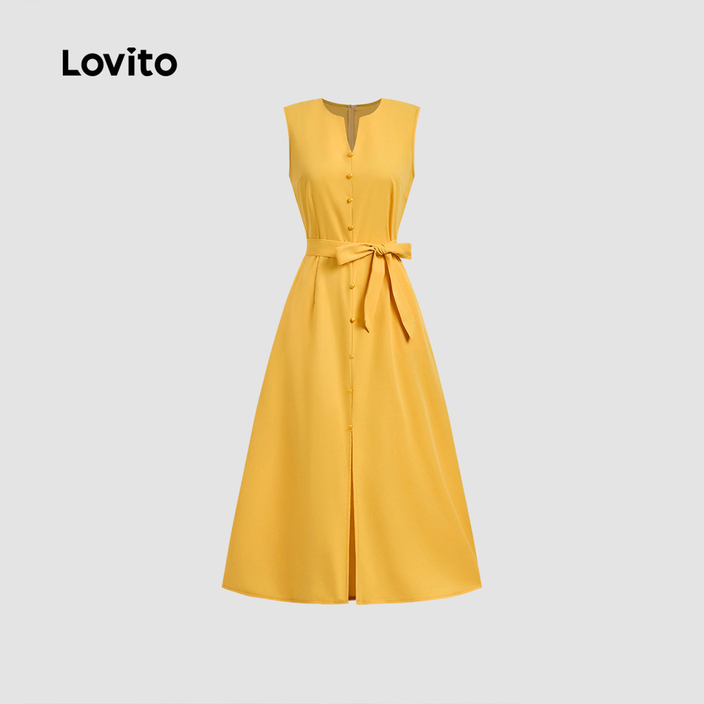 Lovito Vestido feminino Casual com botões para Primavera Verão Amarelo LBL28341