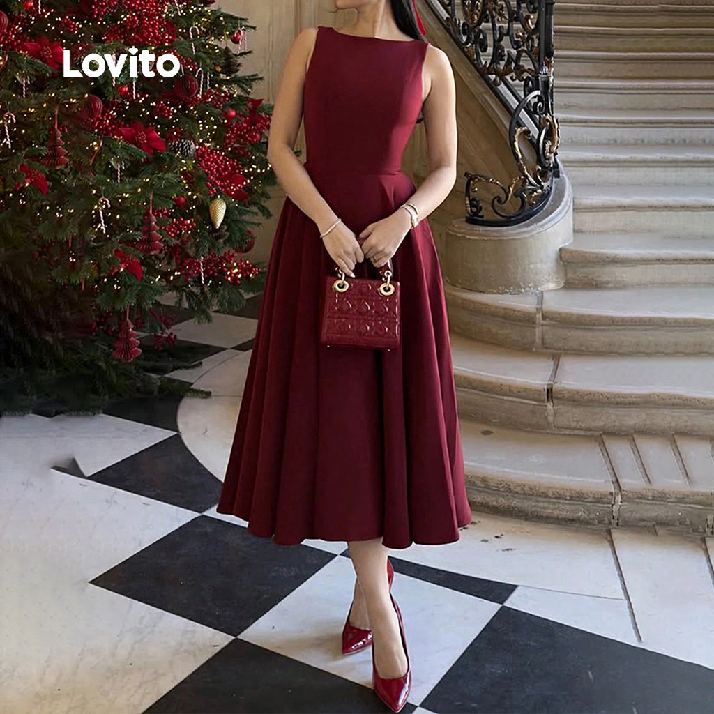 Lovito Vestido Feminino Casual Zíper Pregueado Casamento Festa Vermelho Primavera/verão Cor Vinho LK2ED151