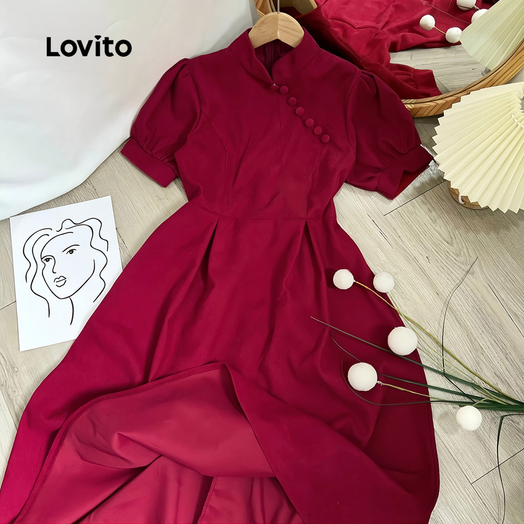 Lovito Vestido Feminino Claret para Primavera Verão com Babado na Barra e Botões L165ED684