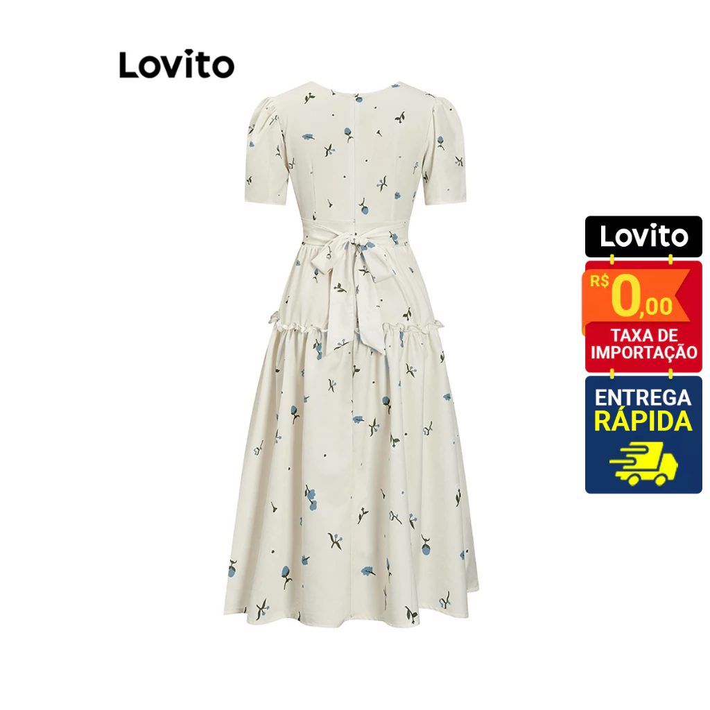 Lovito Vestido Feminino Midi Camponesa com Mangas Bufantes Floral L71ED267