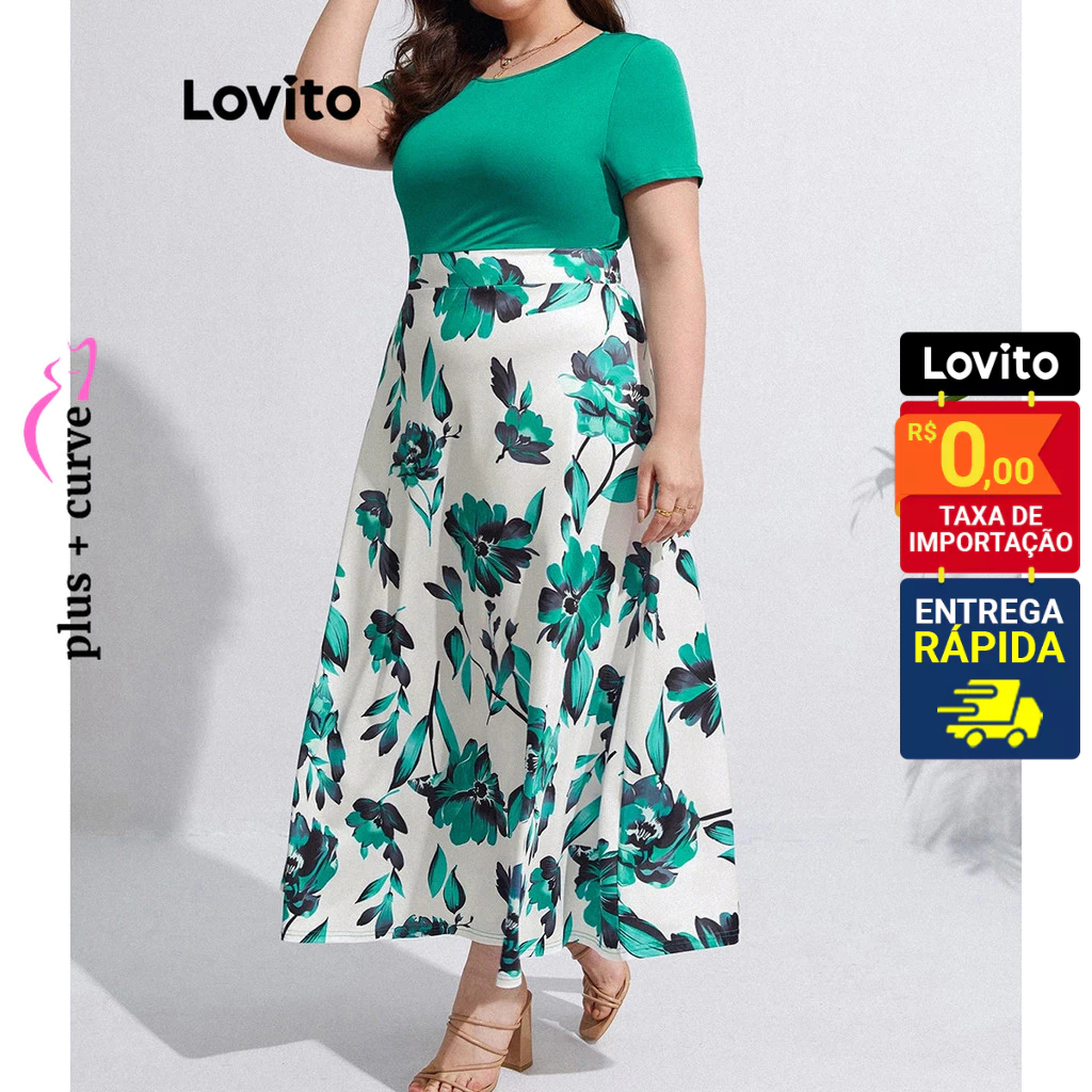 Lovito Vestido Feminino Midi Cores Contrastantes Floral Plus Size LBL09426