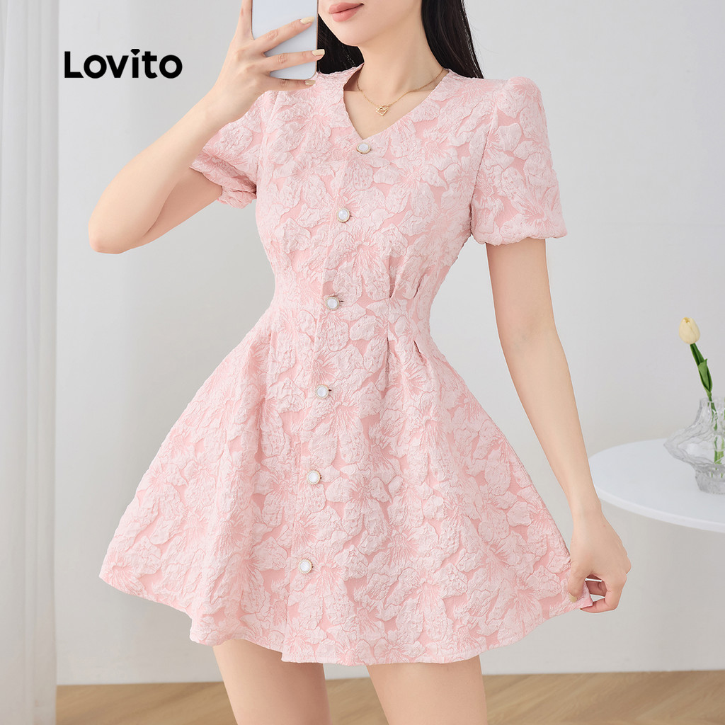Lovito Vestido Floral Com Botão Drapeado Plissado Tecido Vestido De Verão/Primavera Para Mulheres L129AD1051