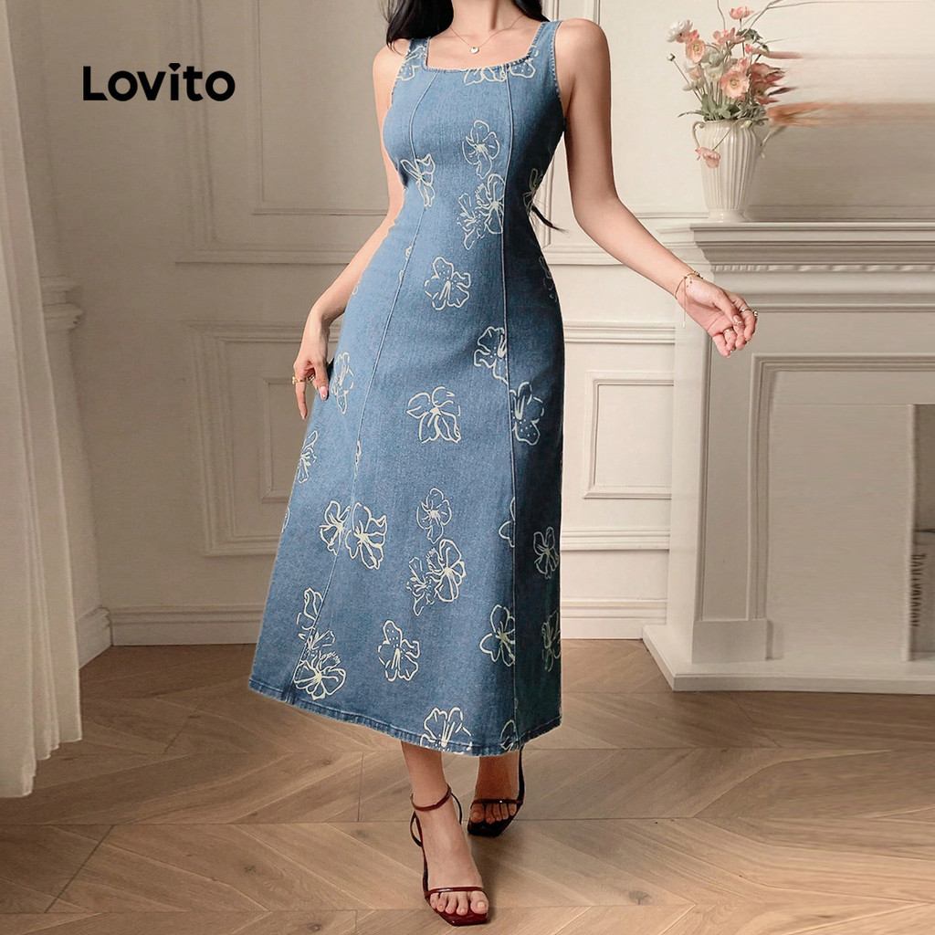 Lovito Vestido Floral de Jeans Elegante Feminino Primavera/Verão Azul LK2LD288