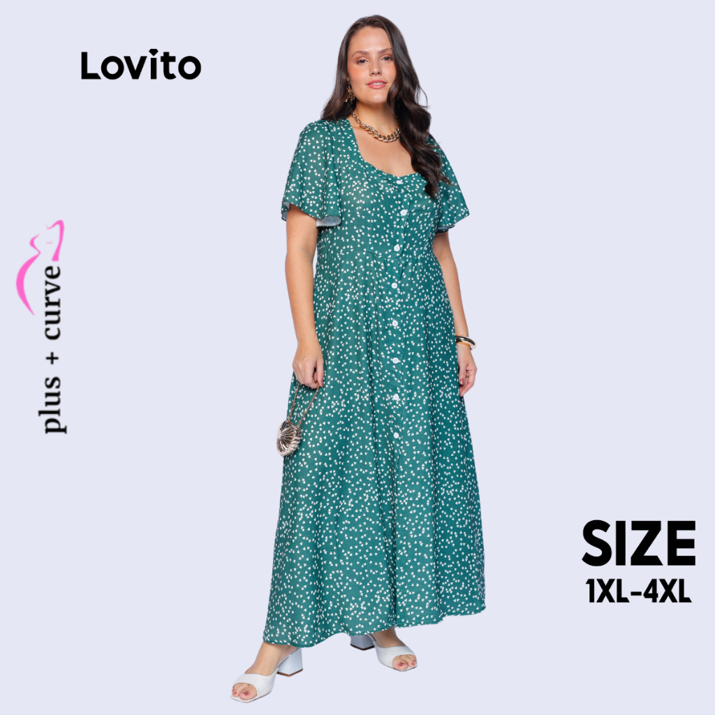 Lovito Vestido Longo Verde Moda Modesta Plus Size Manga Curta Bufante Estampado Feminino LB172BRL201