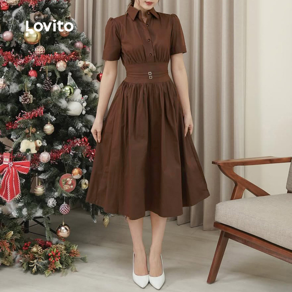 Lovito Vestido Marrom Simples de Botão para Mulheres Primavera/verão casual LK2ED1280