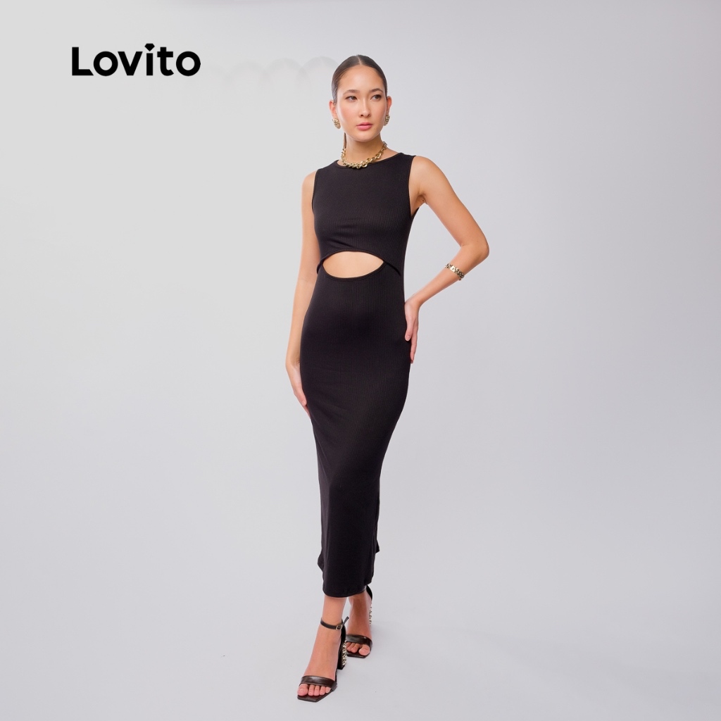 Lovito Vestido Midi Preto Cut Out Casual Lisa para Mulheres DRB1093BRL1123