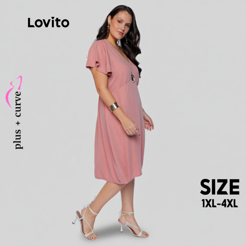 Lovito Vestido Plus Size Curto Decote V Manga Bufante Curta Feminino DRB254BRL283